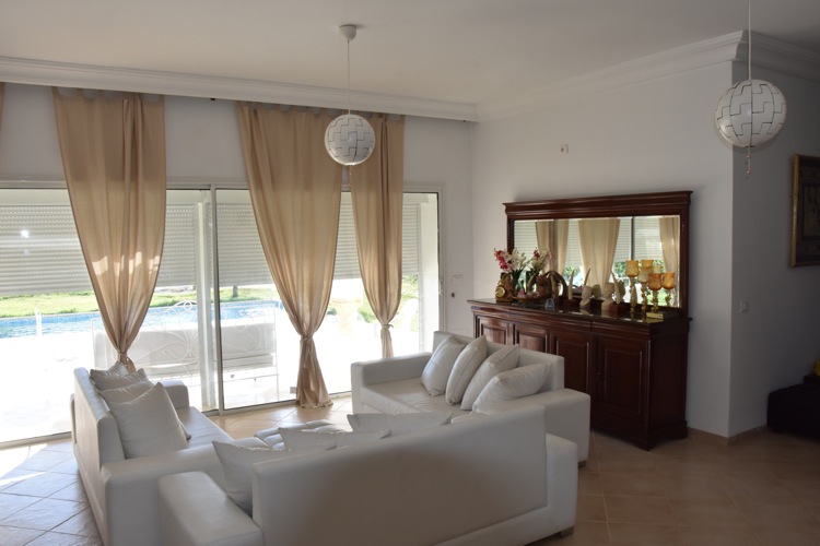 A louer pour des courtes durées, une belle demeure de plein pieds, située dans un quartier calme et serein à El Menchar (environ 7Km d’Hammamet, 7min de Yasmine Hammamet et de Maneret el Hammamet). Elle est bâtie sur un terrain clôturé qui s’étend sur 1500m2 et offre un spacieux salon qui donne à travers 3 vastes baies vitrées sur une grande terrasse, une piscine (8m/4m) sur une pelouse gazonnée et arborée, une cuisine moderne installée et bien équipée, une suite parentale, deux chambres à coucher et une salle d’eau. A l’extérieur, la villa compte une salle d’eau et un débarras, un garage avec portail électrique et 5 caméras de surveillance. La propriété est équipée de climatisation, de chauffage central serpentin au salon et sèche serviettes dans les salles d’eau, de chauffe eau solaire, de téléphone fixe et Wifi.