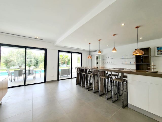 Elle se compose d’un hall d’entrée, un beau salon avec une cheminée et wifi desservant toute la villa, une salle à manger ouvrant sur un beau jardin et la piscine, un vaste jardin d’hiver, une cuisine bien équipée, une salle d’eau visiteurs, quatre suites chacune avec un dressing et salle d’eau dont la suite parentale avec un très grand dressing et salle de bain avec douche et double lavabo.