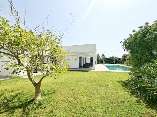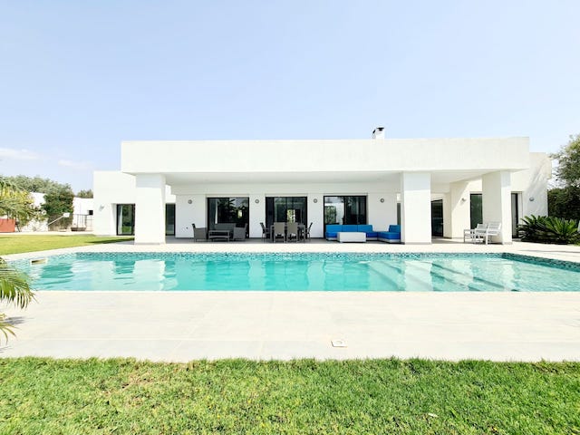 Sur un terrain de 1500m2 et une surface bâtie de 480m2, disponible à la location estivale une luxueuse demeure de plain pied, richement meublée, située dans un cadre verdoyant et serein à Hammamet.