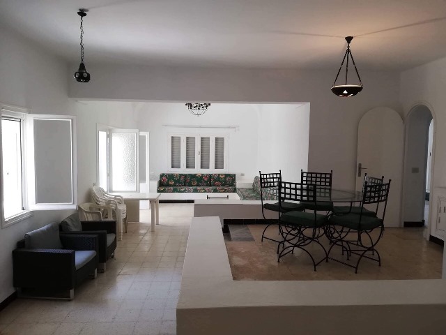 A louer pour des courtes durées, une villa indépendante, de plain-pied au style arabe avec des arcades et voutes croisées, située à sidi Mahersi à 300m de la plage. Elle offre un spacieux salon, une salle à manger, une cuisine, une suite avec une salle de bain, deux chambres à coucher et unes allé d’eau. Elle est équipée de climatisation et bénéficie d’une belle terrasse aménagée qui donne sur un grand jardin gazonné et bien entretenu.