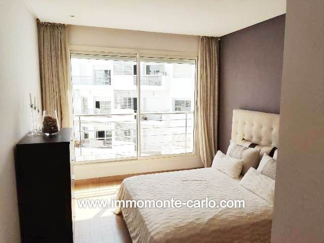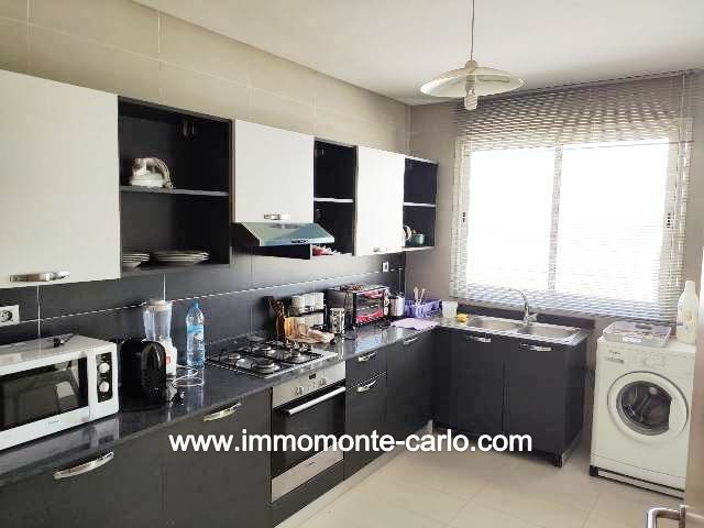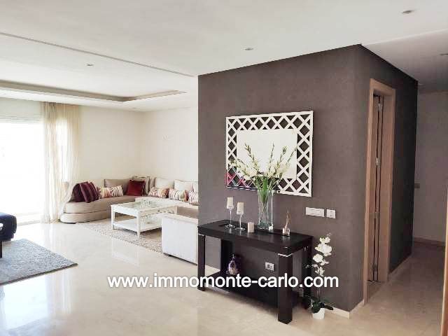 Location Appartement bien meublé à louer àPrestigia Ryad Al Andalous Hay Riad, avec une grande terrasse sans vis-à-vis, situé dans une résidence fermée sécurisée 24H/24H et proche de toutes commodités, au 4èmeétage avec ascenseur ainsi une place dans le garage et parking extérieur,