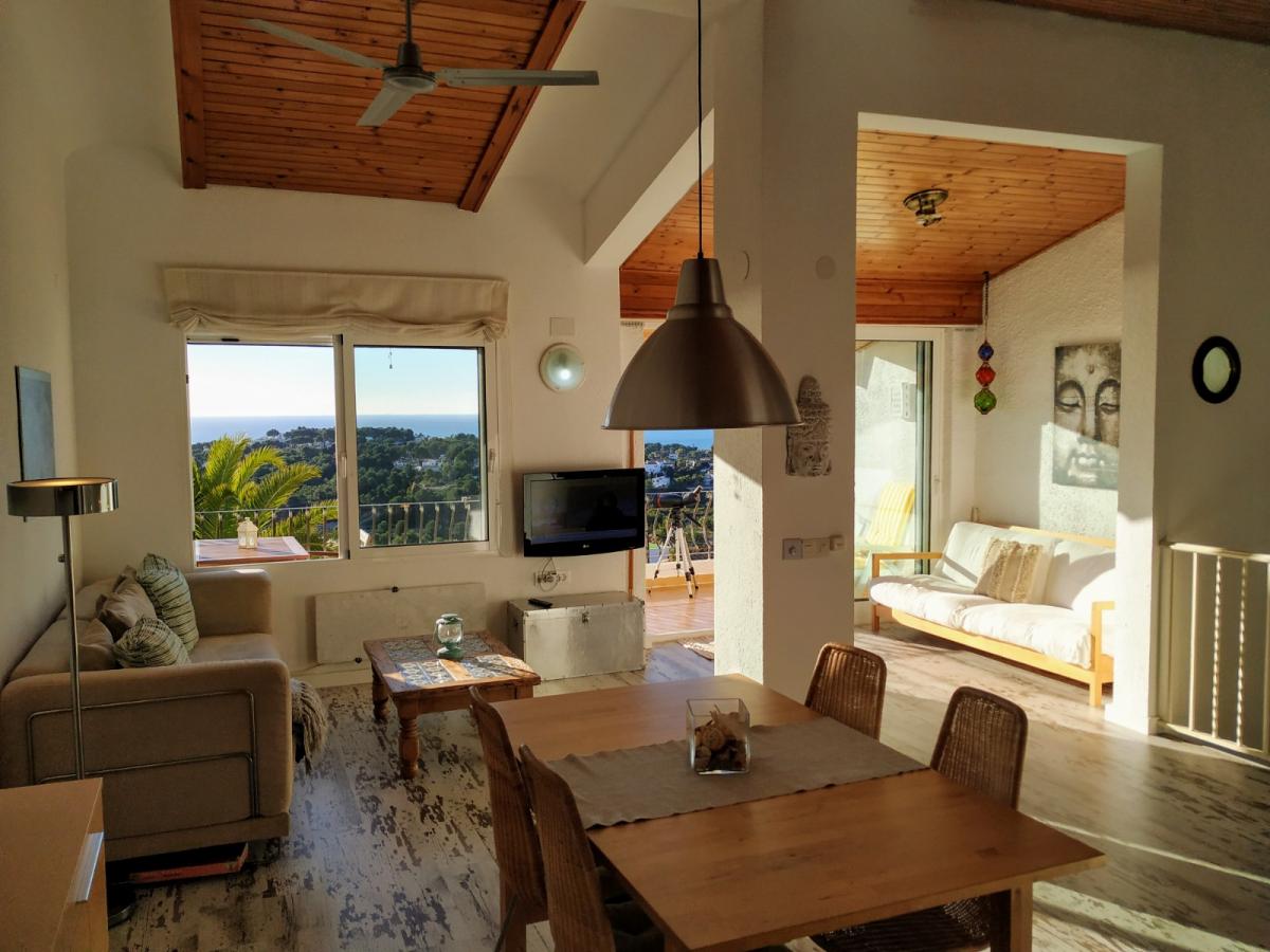 Maison située sur une colline, dans un petit complexe résidentiel privé avec piscine communautaire, beaucop de palmiers et à seulement 3 km. de Moraira et des plages.