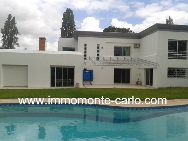 Villa à louer à Rabat, jolie villa bénéficiant de prestations luxueuses, avec piscine, chauffage, panneaux solaires, puit. Situé sur un endroit tranquille en plein cœur d’un quartier branché et résidentiel .Villa construite sur 2 niveaux avec un beau jardin fleuri et grand garage, comprenant double salons avec un coin cheminée, une grande terrasse couverte offrant une superbe vue sur la piscine et le jardin ,un séjour lumineux, une salle à manger, WC des invités, 5chambres : une suite parentale avec dressing et salle de bain avec jacuzzi, grande terrasse, chambre d’amis avec salle de bain, 3chambres à coucher chacune avec sa salle de bain et balcons, une cuisine aménagée, buanderie, logement de personnel, débarras,...