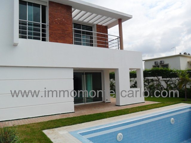 Location villa neuf avec chauffage central et piscine sur la route de Zaers à Rabat, entourée d’un joli jardin avec piscine, construite sur trois niveaux comprenant chambre parentale avec SDB et dressing, 2 chambres à coucher avec placards, salle de bain, terrasse et balcon, triple salon avec un coin cheminée, salle à manger, une grande chambre, 2 WC, une cuisine équipée, box garage et logement de gardien…