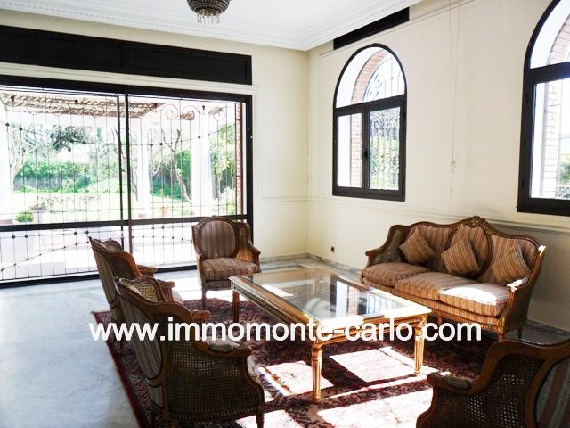 Location une belle villa à Rabat Souissi, villa avec chauffage central sur un terrain de 2000 m², entourée d’un joli jardin, grande garage, villa éclairée et bien placée proches de toutes commodités, composée de 3salons dont un avec cheminée, séjour, un beau grand bureau en mezzanine, 2 terrasses, 4 chambres dont une chambre parental avec dressing et salle de bain, 2salles de bain pour enfants, cuisine équipée et au sous-sol : une deuxième cuisine, salon, 2chambres avec 2salles de bain, bain turque, débarras, buanderie,