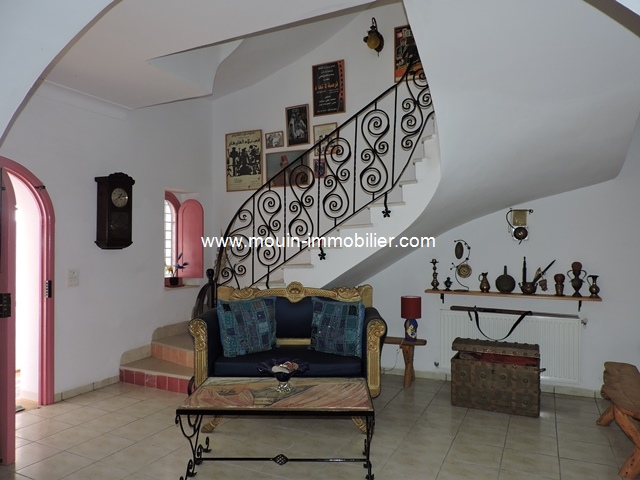 Elle se situe à 10 min du centre ville d'Hammamet. Erigée sur deux niveaux elle est disposée comme suit: Le rez-de-chaussée comprend un salon avec coin cheminée avec voûtes croisée en briques apparentes, une chambre, une cuisine avec un coin repas et une salle d'eau.