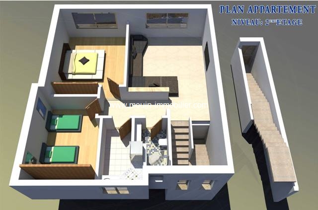 A vendre un appartement en cours de finition situé au dernier étage d’une petite résidence de type R+2 à cité AFH Mrezka. La résidence compte un duplex au rdc, un appartement au 2éme étage (objet de cette annonce) et un petit studio indépendant. Les trois biens disposent des entrées indépendantes. L’appartement est composé d’un salon, une cuisine moderne, deux chambres à coucher avec des dressings, un hall, une salle de bain avec une douche à l’italienne et une grande terrasse privative au toit ayant une vue dégagée. Remise des clés Mars 2017