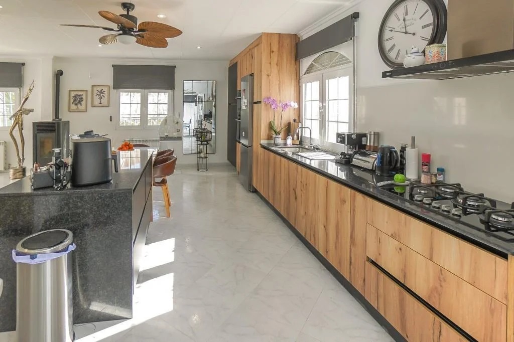 Après la cuisine, un second séjour dessert les 3 chambres (2 doubles et 1 simple) avec armoires encastrées et 2 salles de bains attenantes, l'une avec douche à l'italienne et l'autre avec jacuzzi. L'ensemble de la maison bénéficie d'un chauffage central au gaz. L'installation récente de 12 panneaux solaires avec batteries de stockage d'énergie permet de réaliser des économies d'électricité de jour comme de nuit.