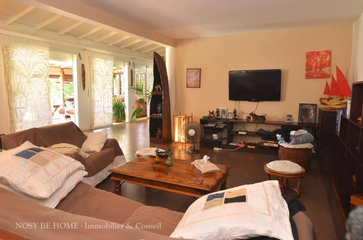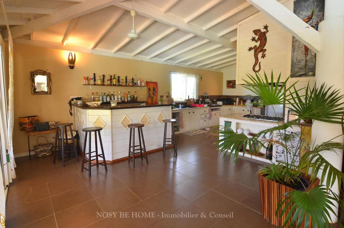 - 1 grande pièce à vivre comprenant le séjour, une belle cuisine équipée ouverte avec bar, plan de travail et de nombreux espaces de rangement ainsi qu'un bureau d'accueil.