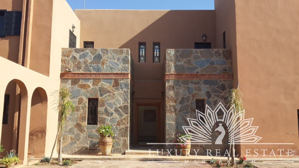 Villa route du barrage, 1 hectare de jardin, 550m² de superficie construite, style riad moderne, 5 chambres à coucher dont une suite parentale à l’étage, vue imprenable sur l’atlas.