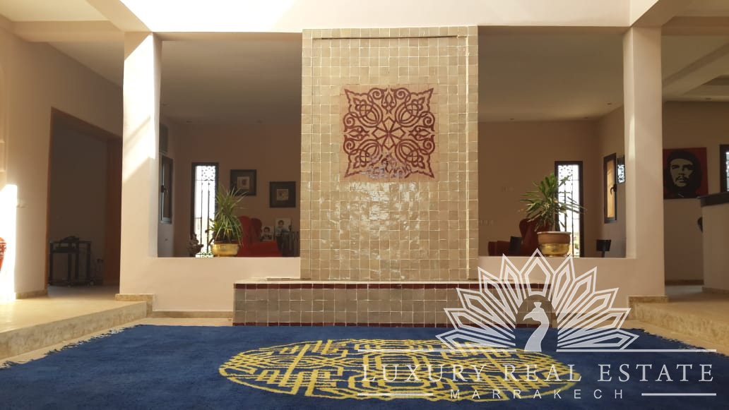 Villa route du barrage, 1 hectare de jardin, 550m² de superficie construite, style riad moderne, 5 chambres à coucher dont une suite parentale à l’étage, vue imprenable sur l’atlas.