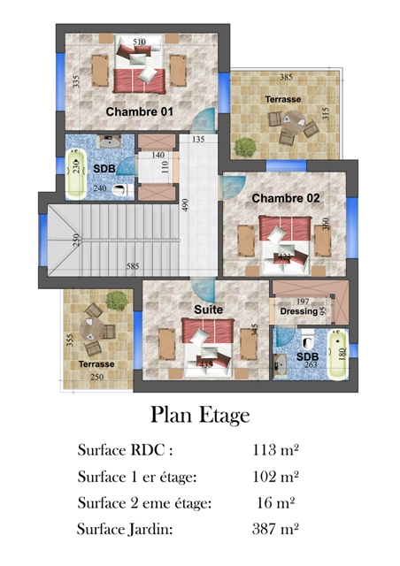 A l'étage, une suite parentale, deux chambre à coucher, une salle de bain et une belle terrasse.