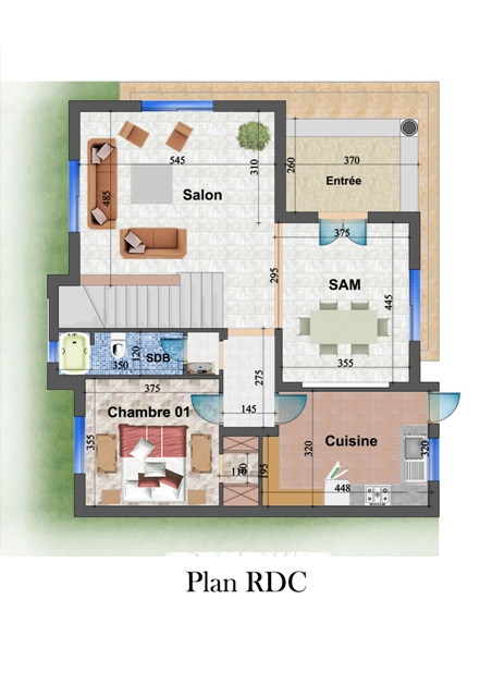 La villa est érigée sur deux niveaux, elle comporte au rez de chaussé, un grand salon, une salle à manger, une chambre à coucher, une salle de bain et une belle cuisine moderne.