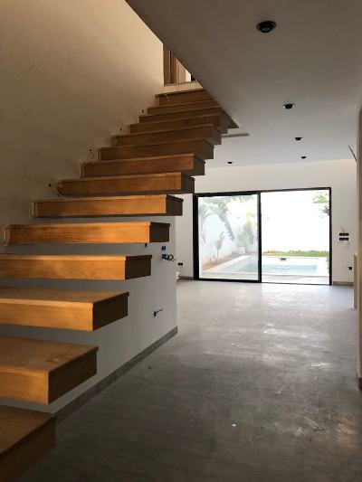 Quant à l’étage (120m2), on trouve une suite parentale, deux chambres à coucher et une salle de bain com-mune.