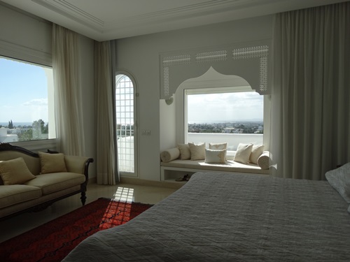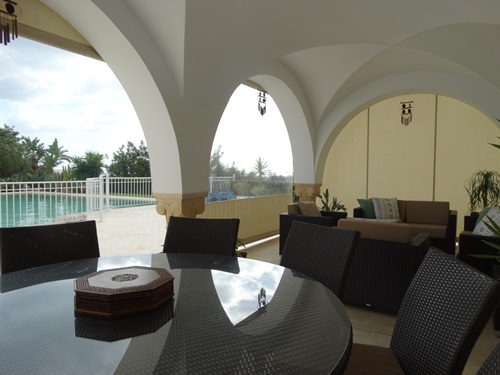 Quant à l'étage il y'a une suite avec un balcon, une deuxième suite parentale avec une grande salle de bain et une belle terrasse aménagée avec un escalier privé donnant sur la piscine et le jardin, cette terrasse sous forme d'un solarium, est un chef-d’oeuvre, bénéficiant d’une vue dégagée sur toute la ville d’hammamet avec sa plage et les environs avec une vue panoramique sur les collines et les vergers.