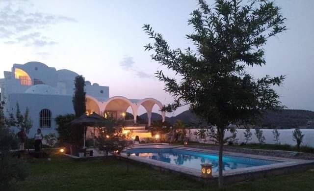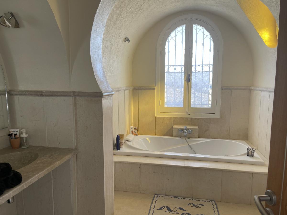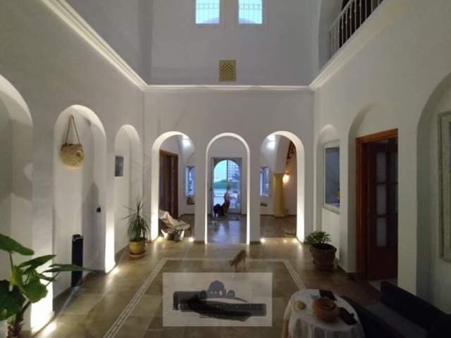 Demeure de charme située sur les hauteurs d’Hammamet, dans un quartier calme, vue sur mer . Elle est érigée sur deux niveaux et répartie comme suit : Au rez de chaussée, un spacieux salon, salle à manger, une cuisine bien aménagée, une suite et une chambre à coucher. A l’étage, une suite parentale, deux chambres à coucher, une salle d’eau et une deuxième cuisine. A l’extérieur, la villa compte un grand jardin gazonné, une belle piscine, un loge gardien, une chambre de bonne, une buanderie et deux garages. La propriété est équipée de chauffage central et climatisation.