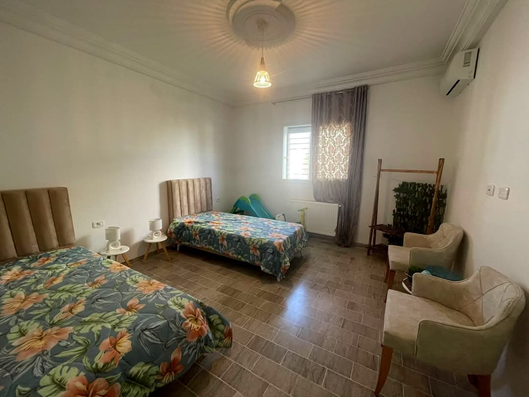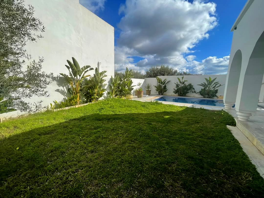 AV belle villa plain-pied, situé à Hammamet sud zone (MONCHAR) ,elle se distingue par son style moderne et style arabesque ,l'entrée bénéficié d'un jardin gazonnée avec abri de trois voitures ,