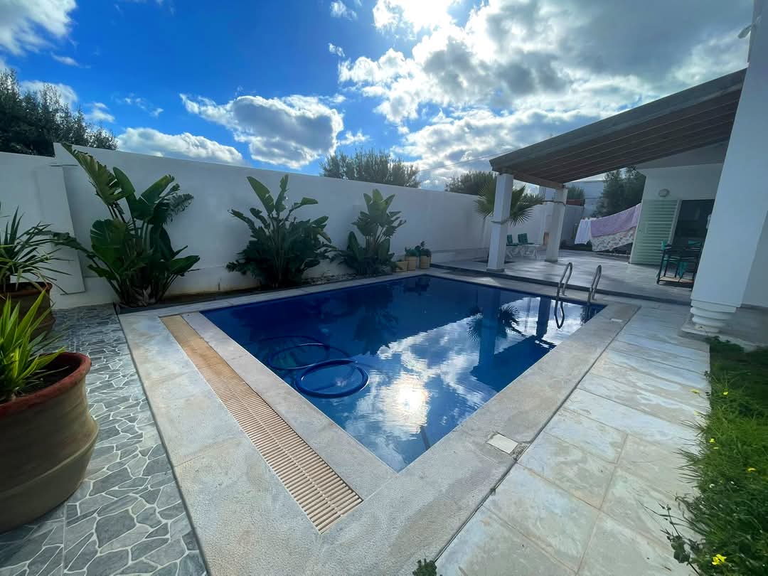 la villa est composée d'un grand salon, deux chambres à coucher avec dressing , suite parentale ,cuisine bien équipée et aménagé , salle de bain ,deux terrasse couvert avec piscine (8/4).la villa est bien équipé par le chauffage centrale et la climatisation .