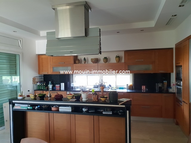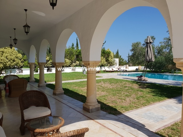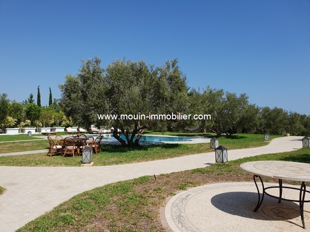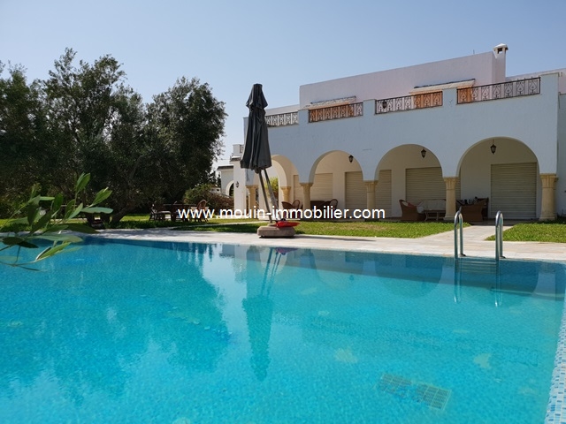 A vendre une demeure de charme exceptionnel, ayant une architecture arabesque modernisée, située à Hammamet Sud – Besbassia. Erigée sur deux niveaux, elle compte au rez de chaussée un spacieux salon, une salle à manger, deux suites, une cuisine moderne bien aménagée et une salle d’eau. A l’étage, on trouve un séjour trois suites et une salle de jeux. La villa est équipée de chauffage central et de climatisation et elle dispose de différentes terrasses aménagées donnant sur un immense jardin gazonné, une belle piscine, un coin barbecue, une douche externe et une loge gardien. La propriété bénéficie d’un grand terrain gazonné en partie et planté d’oliviers, ayant différentes allées menant à la villa. Un véritable lieu de détente.