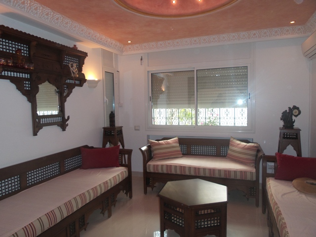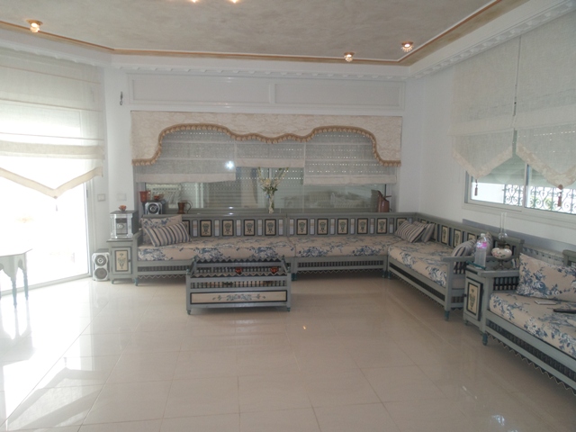 La villa est érigée sur deux niveaux, elle comporte au rez de chaussée un grand salon qui donne sur la pelouse, un séjour, une salle d'eau pour les invitées et une belle cuisine moderne et bien équipée.