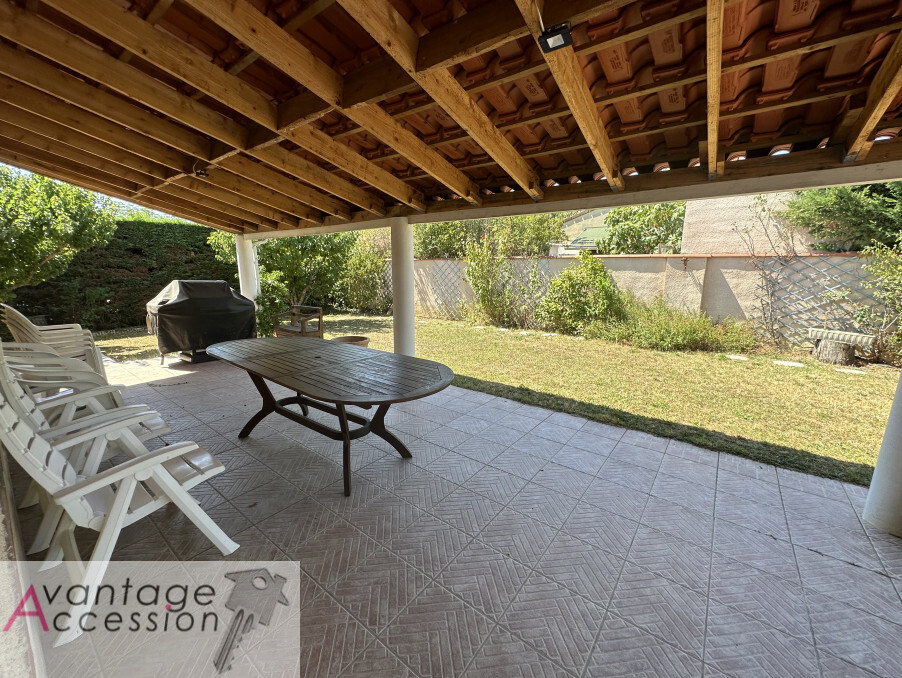 Villa t5 de 120m2 de plain pied, avec piscine, jardin clos et arboré sans vis à vis, située dans un quartier calme et à deux minutes à pieds de tous commerces, écoles et transports. sur une parcelle de 675m2 avec une piscine sécurisée, vous bénéficierez d'une entrée directe sur la pièce vie, avec cuisine meublée et équipée pour une superficie totale de 44m2 prolongée par une grande et agréable terrasse couverte plein ouest. le coin nuit, se compose de 4 chambres et placard, dont une suite parentale avec salle d'eau, une grande buanderie , 2 wc, une salle d'eau. 2 dépendances viennent compléter cette agréable villa. les plus : - bon classement énergétique - emplacement - commerces à pieds - piscine sans vis-à-vis - sa configuration de plain pied très fonctionnelle - volets électriques et double vitrage en oscillo battants. - climatisation réversible et chauffage électrique les informations sur les risques auxquels ce bien est exposé sont disponibles sur le site géorisque. prix de vente: 460 000 euros honoraires agence inclus à charge acquéreur.