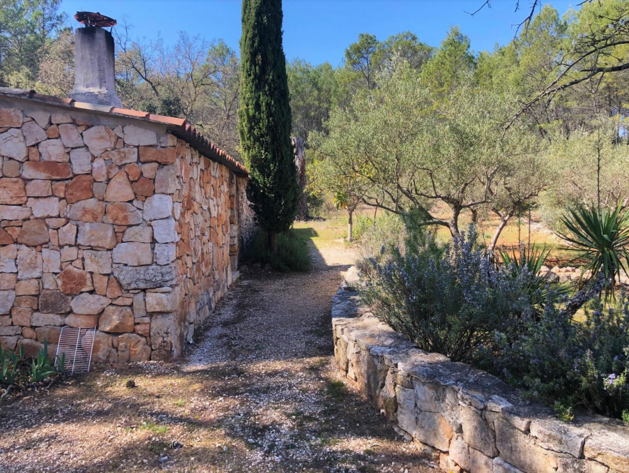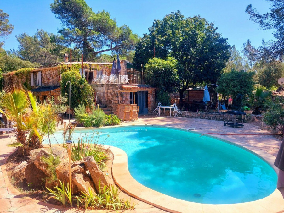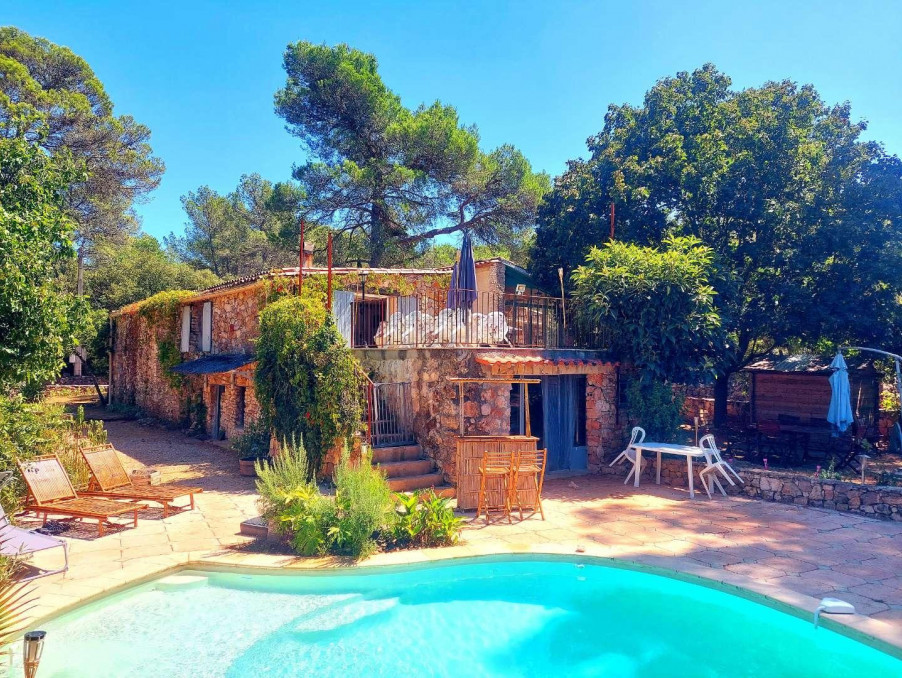 Située dans un cadre enchanteur au cœ ur d'une magnifique forêt primaire, sans aucun vis-à-vis dans un rayon de plus d'1 km, dans un environnement naturel authentique d'un calme absolu où la nuisance sonore est bannie, avec pour seuls compagnons : biches, cerfs, renards, écureuils et sangliers. on accède à cette propriété par une piste forestière caillouteuse d'environ 2 km avant de se voir offrir une expérience de vie paisible. loin de l'agitation urbaine, cette propriété d'environ 400 m2 dont 320 m2 habitables, comprend 3 bâtiments distincts, entièrement élevés en pierres de taille, avec une piscine au sel de forme libre, sur un terrain de 3753 m2, arboré d'une vingtaine d'oliviers, de plantes exotiques, d'arbres fruitiers abricotiers, cerisiers, grenadiers, amandiers, nombreux figuiers, et plantes aromatiques telles que romarin, lavande. ce jardin d'éden vous offrira une intimité totale et une atmosphère sereine pour vous permettre de vous ressourcer en harmonie complète avec une nature bienveillante. descriptif : l'ensemble comprend : une maison principale de 215 m2 avec cuisine équipée, un séjour, 3 vastes chambres à coucher de 35m², 2 grandes salle |