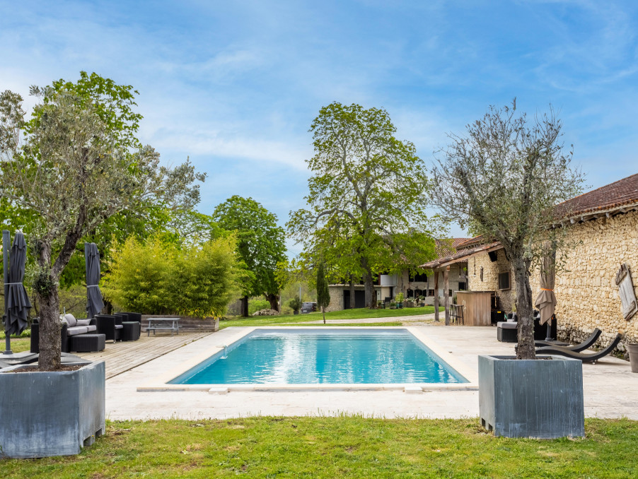 Maison, 2 gîtes/annexes, piscine, terrain, dépendances. propriété historique en pierre, située au bout d'une longue allée privée, dans un endroit fabuleux entre monflanquin et villeneuve sur lot, comprenant une grande ferme du 19ème siècle, avec une chapelle médiévale d'un côté, maintenant convertie en gîte, et un pigeonnier de l'autre côté. rénovée avec goût par ses propriétaires actuels, elle offre un potentiel de revenus ou un endroit où accueillir le flot incessant de visiteurs. comprend la maison principale, avec une terrasse couverte recouverte de glycine sur toute sa longueur, une abondance d'éléments d'époque avec des sols en dalles, des plafonds aux poutres apparentes, des murs en pierre et des cheminées, une cuisine moderne élégante avec des appareils électroménagers intégraux. l'ensemble est décoré avec goût, avec double vitrage, poêle à bois et chauffage électrique. deux autres propriétés, toutes deux avec deux chambres à coucher, sont présentées en excellent état avec des poêles à bois et des cuisines équipées, et offrent un potentiel de location utile. grande grange en pierre, un projet de rénovation potentiel, ou juste un endroit pour garder le |