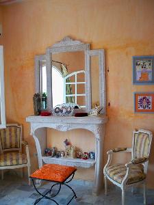 La maison nous accueille par un petit couloir donnant sur une porte cloutée et de part et d'autre du couloir se trouve : et à droite un grand salon donnant sur la terrasse et la piscine, agencé autour d'un magnifique cheminée en marbre sculptée. De l'autr part du couloir nous retrouvons un petit séjour cosi dans des tons rouge corail avec une petite cheminée en brique. Le séjour ouvre sur Une cuisine aménagée et équipée qui compte également un garde-manger.